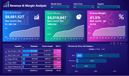 Revenue and gross margin display the operational revenue, best performing month and amount revenue by team, category and supplier. Analyzed using PowerBI